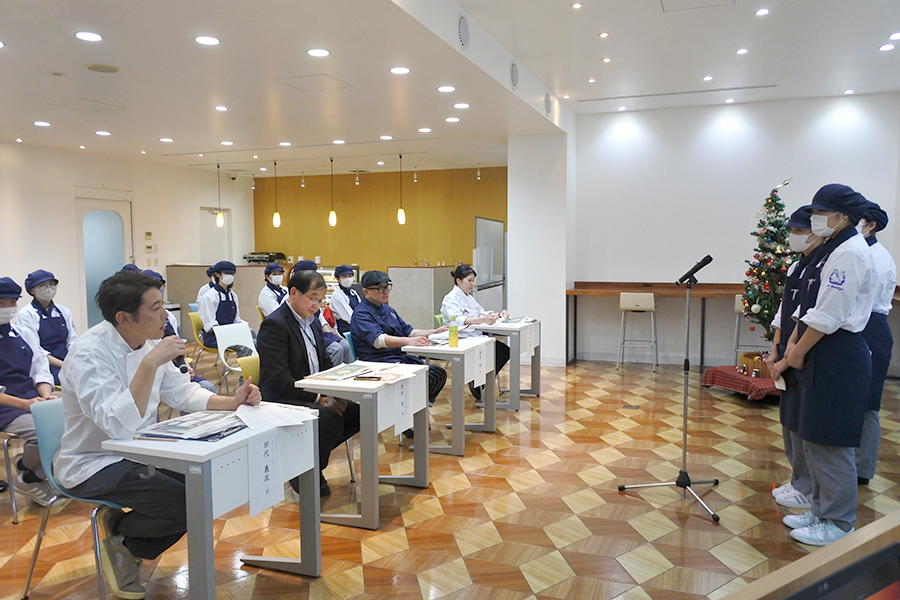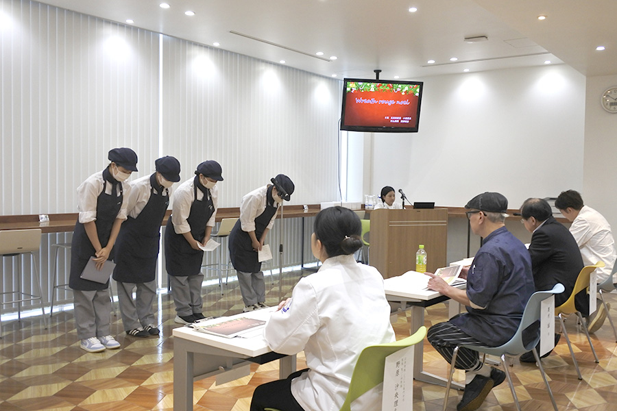 審査には、御殿場の洋菓子店アンドロワ・パレ オーナーシェフ 田代 義政 様、(株)バンデロール 野田 歩 様、カフェ・サンクオーナー 奥村 誠 様にもご協力をいただき、チームごとに自分たちの作ったケーキのコンセプトやレシピ、アピールポイントなどをプレゼン。