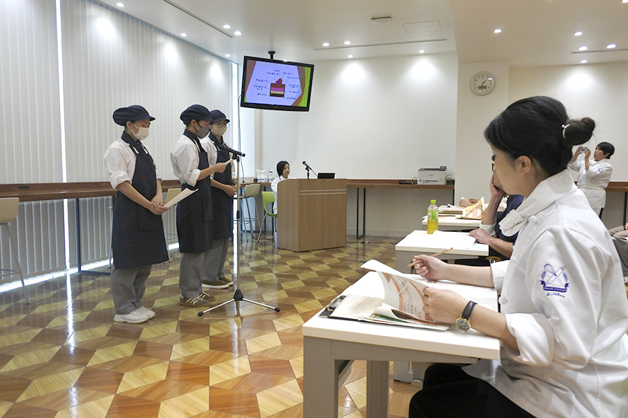 審査には、御殿場の洋菓子店アンドロワ・パレ オーナーシェフ 田代 義政 様、(株)バンデロール 野田 歩 様、カフェ・サンクオーナー 奥村 誠 様にもご協力をいただき、チームごとに自分たちの作ったケーキのコンセプトやレシピ、アピールポイントなどをプレゼン。