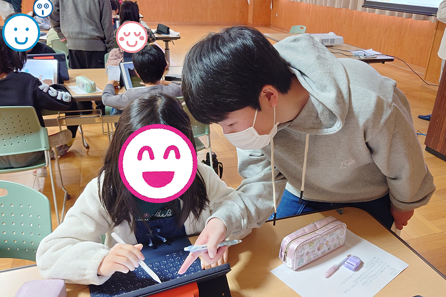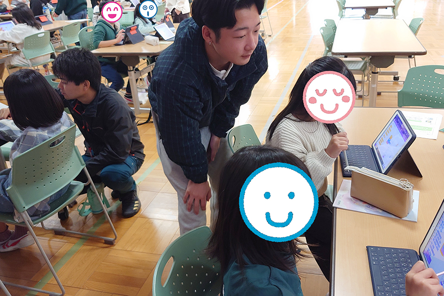 小学生たちが試行錯誤しながらプログラムを作り上げる姿を、学生たちは優しく見守りながらサポートしていました。