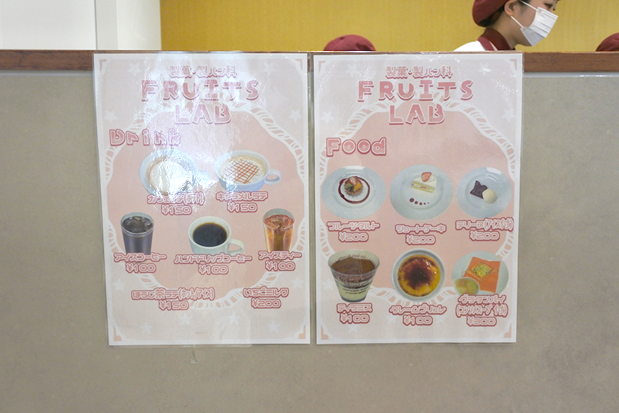 1階のカフェスペース、5階のラウンジをカフェに見立ててポップやメニューなどデザインし、販売商品の大量生産、フードやドリンクのサーブ方法など、授業で身に付けた技術を活かして、「FRUITS LAB」を開店。