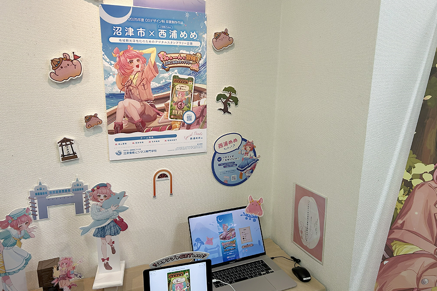 作品展では、静岡県沼津市公認ご当地Vtuber「西浦めめ」さんとのコラボ作品も。フォトスポットやノベルティシール、イラストの展示が行われ、多くの来場者が訪れました。